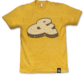 Delicious typography. A super-soft, heather gold tee, printed with everyone's favorite logogram (set in Knockout) using soft, waterbase inks. Peanut butter? Mustard? Fluff? Jelly? Either way, we think the ampersand is a ligature for eat and not et.